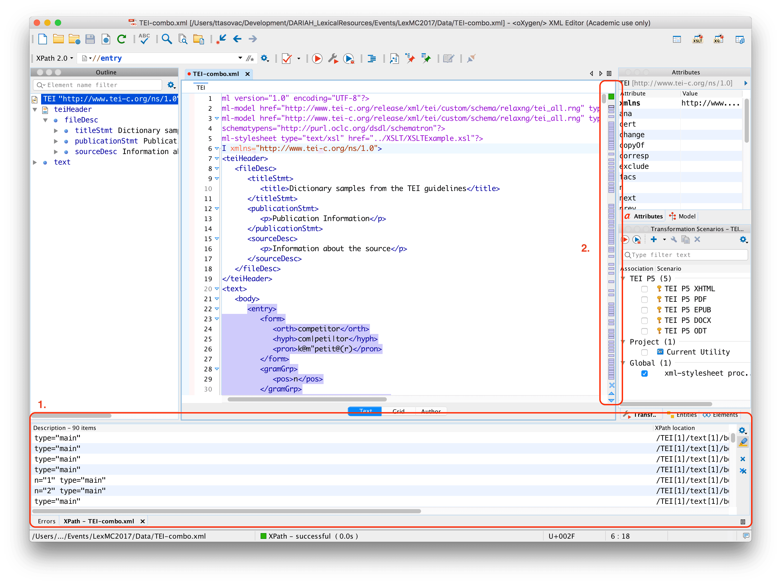 In addition to being useful for studying dictionaries and extracting data from them, XPath is essential to know if you’re planning to use XSLT - a language for transforming XML documents. XSLT is applied to XML documents when we want to change them from one format to another (for instance, XML to HTML) or when we want to change something across dictionary (for instance, changing all entry elements to entryFree etc.)
